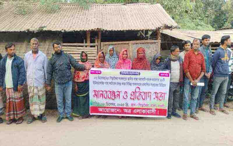 নওগাঁর মান্দা উপজেলায় ইউক্যালিপটাস গাছ কাটার অভিযোগে অসত্য ও যাচাইবিহীন সংবাদ প্রকাশের প্রতিবাদে এলাকাবাসী মানববন্ধন করেছেন।