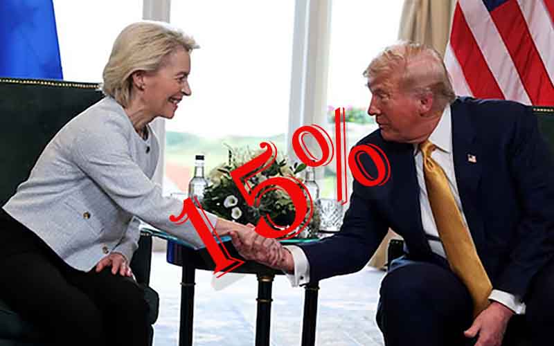 যুক্তরাষ্ট্র ও ইউরোপীয় ইউনিয়নের (ইইউ) মধ্যে বহুল প্রতীক্ষিত বাণিজ্য চুক্তির একটি কাঠামোতে অবশেষে সমঝোতা হয়েছে, যা বিগত কয়েক মাস ধরে চলা অচলাবস্থার অবসান ঘটিয়েছে। স্কটল্যান্ডের সাউথ আয়ারশায়ারে যুক্তরাষ্ট্রের সাবেক প্রেসিডেন্ট ডোনাল্ড ট্রাম্প এবং ইউরোপীয় কমিশনের প্রেসিডেন্ট উরসুলা ভন ডার লায়েনের মধ্যে অনুষ্ঠিত বৈঠকের পর রোববার (স্থানীয় সময়) এই চুক্তির ঘোষণা আসে।